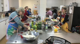Nous organisons des cuisines collectives lors desquelles les femmes partagent un bon moment et repartent avec des portions de nourriture.